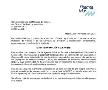 PharmaMar ha logrado su primera autorización en un país europeo de una terapia combinada para el tratamiento en primera línea del cáncer de pulmón de célula pequeña en estadio avanzado (CPCP), un cáncer agresivo y de rápido crecimiento con opciones terapéuticas limitadas, según ha informado este lunes la farmacéutica a la Comisión Nacional del Mercado de Valores (CNMV).