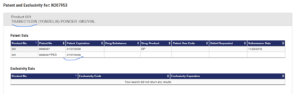 Y en ese mismo Orange Book, la expiración de la patente de Yondelis en USA para mediados de 2028: