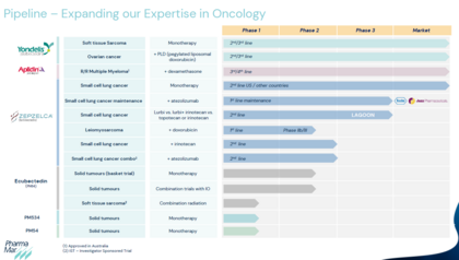 Melanoma: A principios de 2025 también se publicaron preclínicas y nueva patente para esta indicación que mostraban la superioridad de PM54 sobre lurbinectedina y ecubectedina. La inmunoterapia lógica para combinar es del tipo PD-1, como pembrolizumab o nivolumab, que son los estándares de cuidado. Atezolizumab no es adecuado en melanoma porque no es estándar y complicaría mucho la eficacia clínica y la aprobación regulatoria.