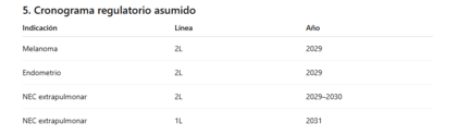 Todo es teórico, en melanoma y endometrio hay más competencia en primera línea, en mesotelioma y NEC extrapulmonar hay menos y más posibiliaddes de aprobaciones aceleradas en USA en base a una fase II, pero volvemos a lo de siempre, esto con una big pharma acelera plazos y maximia las posibilidades que PM54 tenga, sean mayores o menores, y aunque los ingresos no empezarían hasta 2029, los años PER sí podrían empezar a sumar a la cotizaciòn antes