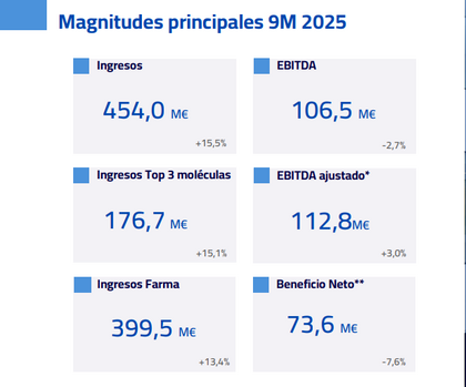 Por su parte, los ingresos ascendieron a 453,99 millones de euros, lo que supone un incremento del 15,5% respecto a la cifra de negocio acumulada hasta septiembre del año pasado. En concreto, los ingresos de la división Farma se elevaron por encima de un 13% en los nueve primeros meses del año, hasta 399,5 millones de euros, gracias al buen comportamiento del mercado en América Latina (+16%, 83,8 millones) y de las licencias (+17%).