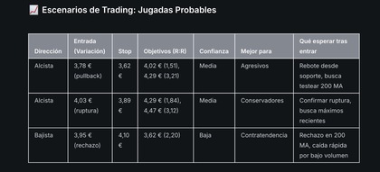 • Invalidación: Pérdida de 3,62 € anula el sesgo alcista; un cierre rotundo sobre 4,02 € habilita nuevo tramo alcista