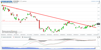 También he visto un ETF que es EAGEU EASYETF BNP PARIBAS GLOBAL AGRIBUSINESS | BNP PARIBAS GLOBAL AGRIBUSINESS que TRATA DE REPLICAR EL COMPORTAMIENTO DEL ÍNDICE BNP PARIBAS GLOBAL AGRIBUSINESS FORMADO POR COMPAÑÍAS DE DIFERENTES SECTORES RELACIONADAS CON LA AGRICULTURA (QUÍMICA, MAQUINARIA INDUSTRIAL, PRODUCTORES, DISTRIBUIDORES). Tiene un aumento de volumen considerable y ha roto la directriz bajista. A ver si puedo subir el gráfico de investing.