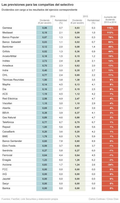 Encabeza la lista Gamesa. Se prevé que el fabricante de aerogeneradores aumente su dividendo un 116%, hasta 6 céntimos por acción. Mediaset podría elevar su dividendo un 112%, hasta 19 céntimos por títulos. Banco Popular mejorará su dividendo un 76%, hasta 7 céntimos por acción.