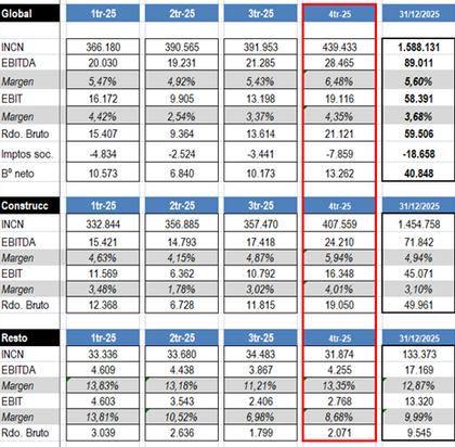Los resultados han sido sorprendentemente buenos, sobre todo los de este 4º trimestre, que empiezan a augurar un muy buen 2026. Sí que es cierto que la facturación no ha crecido, posiblemente por las estrecheces del mercado y las dificultades de producción, pero el dato que hay que vigilar no es tanto la facturación como la cartera de obra, que sigue creciendo de forma constante. Además, es una obra a la que cada vez se le saca más rendimiento.