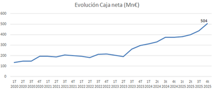 Si la posición neta a 31-12-24 era de 373M, un año después ha sido de 504M. La gráfica con su evolución impresiona…