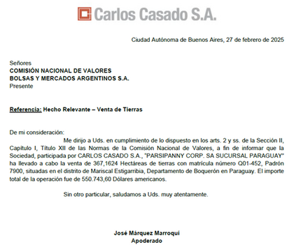 El 27 de febrero de 2025 se informó a la Comisión Nacional de Valores y a Bolsas y Mercados Argentinos S.A. la venta de 367,1624 hectáreas, y el importe total de la operación arrojó un precio medio promedio de USD 1.500 por hectárea. Al 30 de junio de 2025, la Empresa posee 199.727 has. Brutas totales en el Chaco Paraguayo. De este total, 159.013 hectáreas cuentan con licencia ambiental