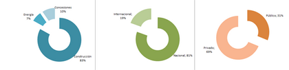 En cuanto a la distribución, vemos un peso mayoritario de la construcción sobre el resto de las áreas operativas, una concentración nacional/internacional alrededor del 80%-20% y un peso del cliente privado/público del 70%-30% de forma aproximada.