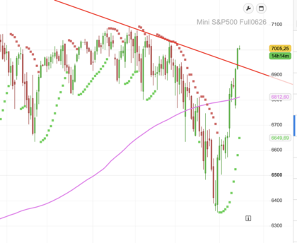 Otro aspecto que me llama la atención es como el futuro del SP500 ha sobrepasado esta directriz con 3 apoyos, lo normal sería un pullback al 6900 almenos y retestear esa zona 2 o 3 jornadas.