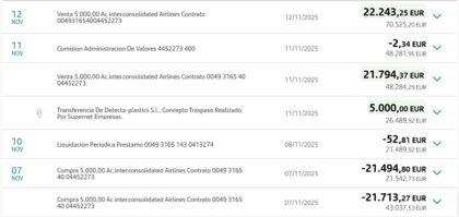 La cartera grande está -178€ este mes de Noviembre. Os pongo un pantallazo de la compraventa de acciones, las opciones están en otro broker. Vuelvo a tener bastante liquidez La broma de las puts que me ejecutaron, a precio de mercado de ayer me costó una pasta, a precio de hoy unos 750€ ......y según suban el daño baja.