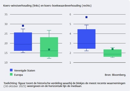 A la izquierda, el puntito marca el PER actual, a la derecha la relación precio-valor contable. EEUU en azul, la zona coloreada indica el valor histórico, muestra el puntito en el caso de EEUU muy por encima de esa zona.