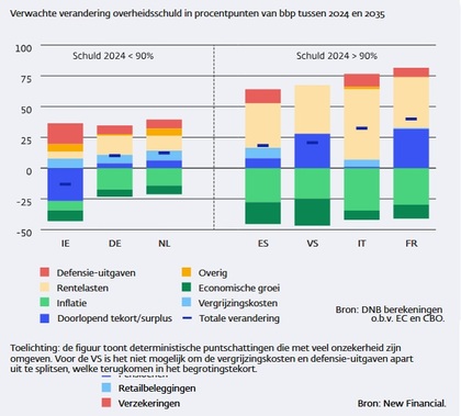 En azul el déficit presupuestario, en azul claro el coste del envejecimiento, en rojo gastos de defensa, en amarillo pago de intereses, en verde oscuro el PIB (reduce la deuda), y verde claro la inflación (reduce la deuda, funciona como un impuesto). Para EEUU, el déficit presupuestario (azul) incluye también los gastos de defensa y por envejecimiento, que no se desglosan. La raya pequeña en azul (-) muestra el efecto total.