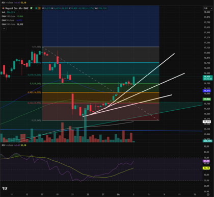 Repsol se encuentra en fase de activo "Alpha" (activo de inversión) dentro del mercado español. Técnicamente, el activo ha entrado en una fase de expansión acelerada ("Atenea"), rompiendo resistencias y alejándose de sus medias con una fuerza inusual. Lo fascinante de este movimiento es que ocurre bajo un manto de escepticismo y miedo generalizado (xxxxxxxxxx), lo que confirma que estamos ante una subida sana, impulsada por dinero inteligente y no por euforia minorista.