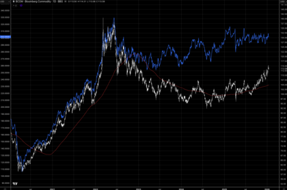 CBR por encima de BCOM. - CBR por encima de BCOM suele ser un mercado de commodities sano, con curvas en backwardation y roll yield favorable. - Suele ser un entorno positivo para estrategias de materias primas.