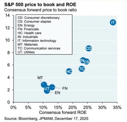 Podemos ver cada sector del S&P 500, su relación PRECIO/Valor en libros respecto al ROE (El retorno del capital).