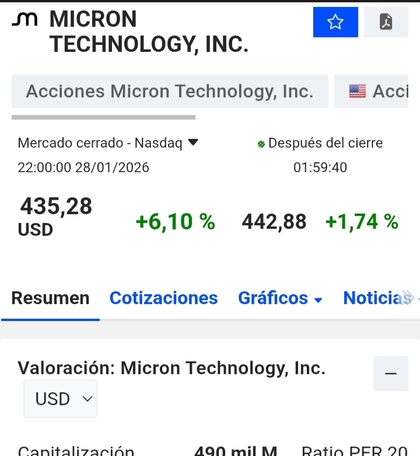 El mayor fracaso que he tenido en mi vida inversora, no quedarme con Micron Tech hasta la eternidad, la compré hace años a 56usd las solté a 77us, la he tenido el año pasado a 119 us y la solté meses despues a 154 us y hoy cotiza a 435 usd y no deja de subir todos los puts días.😬😬
