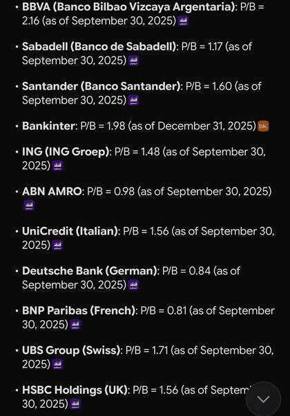 No sé cuanto pueden seguir subiendo, pero la banca europea comienza a estar cara. Datos (ratio precio/valor contable) recopilados por Grok de hace unos meses (la banca siguió subiendo):