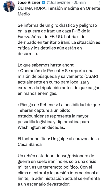 "En un giro inesperado de la crisis, un avión F 15 de EEUU habría sido derribado en Irán y hay una operación de rescate en curso para recuperar a la tripulación. Un rehén en manos de Teherán puede tener un efecto político devastador para la Casa Blanca"