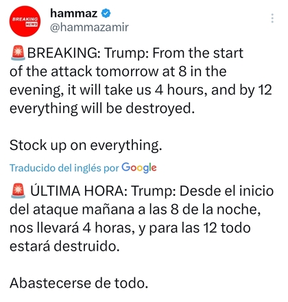 Donald Trump dijoque Irán tiene hasta las 8 p.m. (hora del Este) del martes por la noche. (02:00 de la madrugada del miércoles en España.