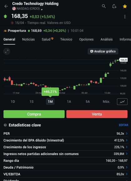 Estoy dentro de Microsoft y encantado con la última semana. Lo que estoy flipando es con Credo Technology La subida del último mes es tremenda y te da que pensar si aún es tarde para entrar, los datos de ingresos...