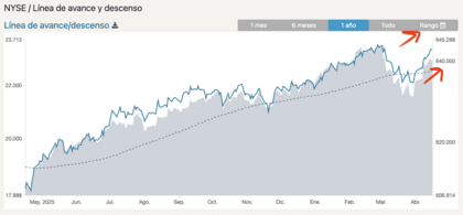 Empecemos con algún indicador que soporta la tesis de subida. Línea avance desenceo en el NYSE con divergencia alcista. A punto de hacer nuevos máximos el AD que sin que el NYSE lo haga.