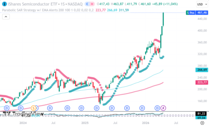 Los semiconductores lideraron las alzas, con el $SMH avanzando más de un 5%.