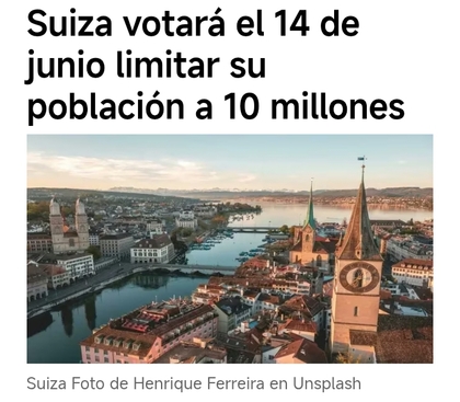 El 14 de Junio se llevara a cabo un referendum si se aplica o no el limite de poblacion en Suiza de 10 millones de habitantes en el año 2025 rondaba los 9,1 millones eso supone si votan a favor que ni inmigrantes y otros no pueden residir en Suiza