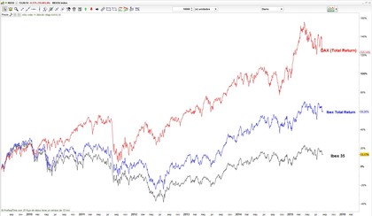 Gracias en Proreal, de hecho aquí una pequeña comparativa de los últimos 6 años (desde el 18 agosto 2009), el DAX supera con creces al Ibex Total Return (con dividendos), pero se puede ver la diferencia de rentabilidades entre el Ibex y el Ibex TR.