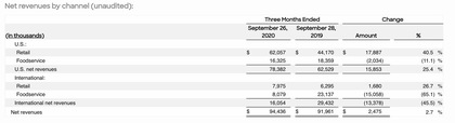 Net revenues increased 2.7% to $94.4 million in the third quarter of 2020, compared to $92.0 million in the year-ago period. Growth in net revenues was primarily due to increased retail channel sales, largely offset by a decline in foodservice channel sales due to the continued impact of COVID-19 on foodservice demand levels. In addition, during the third quarter of 2020, retail channel net revenues were negatively impacted by a surge in retail consumer demand in the second quarter of 2020 due to the onset of the COVID-19 pandemic, which resulted in consumer freezer loading and, in turn, contributed to sequentially weaker demand in the third quarter of 2020. Growth in volume sold during the third quarter of 2020 was partially offset by lower net price per pound driven by the Company’s strategic investments in promotional activity intended to encourage greater consumer trial and adoption, and, to a lesser extent, product mix shifts as larger-pack items carrying a lower net price per unit volume accounted for a greater proportion of the Company's retail net revenues compared to the year-ago period.