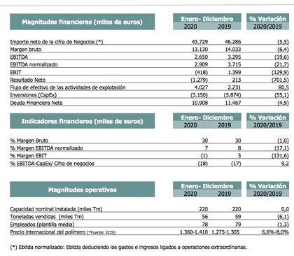 PLÁSTICOS COMPUESTOS, S.A. 14 de mayo de 2021 "En el marco de la recuperación de la actividad a niveles anteriores al Covid-19, la Sociedad ha obtenido en los primeros cuatro meses de 2021 una facturación bruta aproximada dediecinueve (19) millones de euros y un EBITDA normalizado positivo de 1,8 millones de euros".