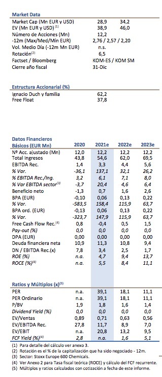 Esta operación se produce en un contexto en el que Kompuestos ha alcanzado cifras récord de ventas. En el primer trimestre de 2021 ya se aprecia una recuperación en los resultados operativos, con un aumento de las ventas del 16,9% en relación con el primer trimestre de 2020. Además, el EBITDA del primer trimestre de 2021 creció un 57,7% frente al primer trimestre de 2020. Los últimos resultados avanzados por la compañía a 30 de abril de 2021 confirman esta evolución y muestran una facturación en el entorno de los 19 millones de euros y un EBITDA normalizado que se sitúa en 1,8 millones de euros. “Una tendencia positiva que esperamos que continúe a medida que la economía mundial se recupera progresivamente”, apunta Duch.