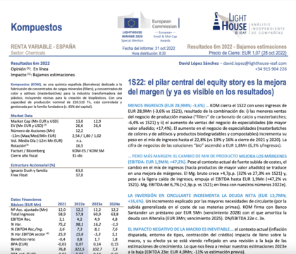 Barcelona, 19 de julio de 2021. Kompuestos (Plásticos Compuestos S.A.), compañía líder en la producción de compuestos sostenibles para plásticos en Europa, ha comenzado a cotizar hoy en el Euronext Growth de París, mercado bursátil especializado en empresas de pequeña y mediana capitalización, a un precio de salida de 2,38 euros por acción y una capitalización bursátil de 28,93 millones de euros en el día de su debut en Euronext, tras recibir la admisión a cotización de 12.155.700 acciones. Su código de negociación es “ALKOM” y cotizará bajo la fórmula de dual fixing.