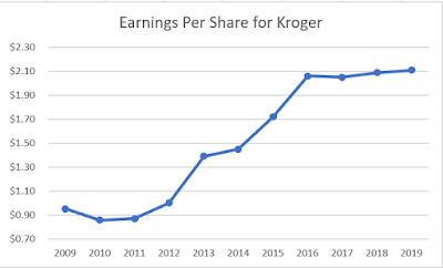 Kroger managed to grow earnings per share from 95 cents/share in 2009 to $2.11/share in 2019. The 2019 numbers are adjusted to exclude the gain on sale of Kroger’s convenience store business. The company expects to generate between $2.15 - $2.25/share in 2020. This would be a nice move up, given the fact that earnings per share have gone nowhere since 2016.