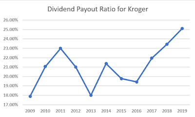 Kroger has rewarded shareholders handsomely with dividends and share buybacks. Between 2009 and 2019, the number of shares outstanding has gone down from 1.31 billion shares to 818 million shares. This means that shareholders from 2009, who stayed invested in Kroger, increased their ownership in the company without doing anything.