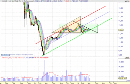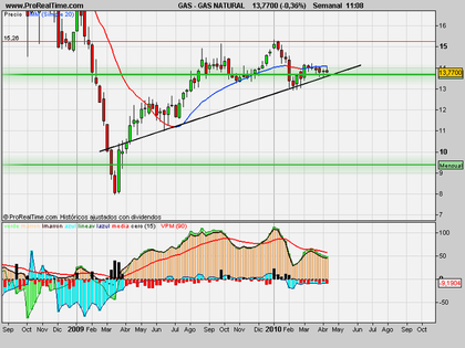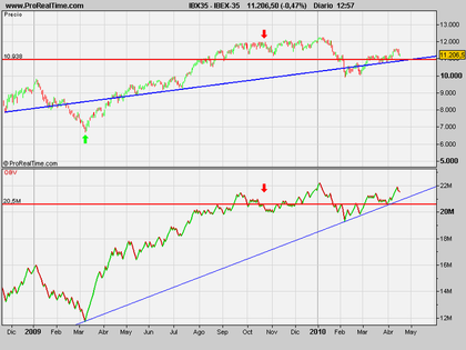 El volumen sigue ascendiendo sobre una línea directriz que no debe perder si quiere mantener una complicada progresión alcista.