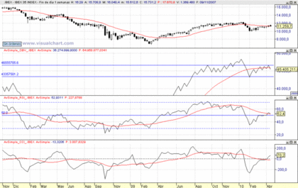 IBEX35_Delicada situación atraviesa el IBEX. Se encuentra en gráfico semanal sobre su MM(20) y con RSI>50, pero al límite.