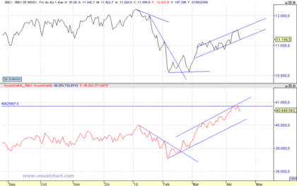 Generalmente prefiero seguir las tendencias de los precios indirectamente, a través de la tendencia del OBV, para hacerme una idea de las intenciones del mercado a corto Parece que el volumen sigue fluyendo hacia adentro. Y respecto a telefónica, creo que eso se llama acumular procurando no disparar los precios arriba. ¿Que creéis, subirá el ibex?