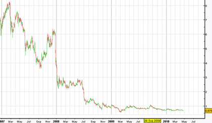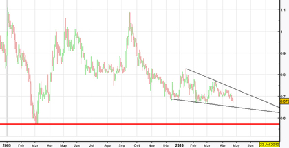 Sigue bajista para largo plazo y es mejor estar por el momento fuera. No entra fuerza compradora con lo que con cada subida para corto plazo tienen muchas posibilidades de retroceder rápidamente. Mientras no supere los 0.75 en este trimestre no hay que entrar ni vigilar el valor.