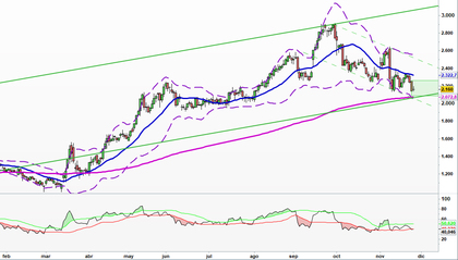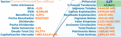 Los datos fundamentales indican un PER negativo por los resultados. Tiene una deuda total del 94%. Su ratio de solvencia se sitúa en 2,7. El valor de la empresa es superior a la capitalización del mercado. Mi ratio potencial sale a 5,2, indicando crecimiento económico. Mi fuerza de tendencia sale 45%, indicando crecimiento alcista.