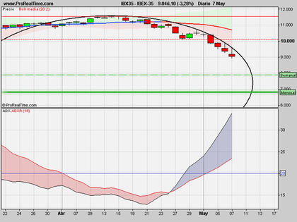 Si no necesitas el dinero aguanta las TEF, respecto a que si bajaremos de los 8.800, te diré que me parece que sí (seguramente con un rebote antes pues los indicadores ya empiezan a marcar sobre venta), pero tal como viene la caida tiene toda la pinta de seguir cayendo. Hay un hueco en los 8.120 - 8.000 que muy probablemente baje a cerrar. A día de hoy los 7.700 aunque lejos los veo cada vez más probables, pongo gráfico, un saludo.