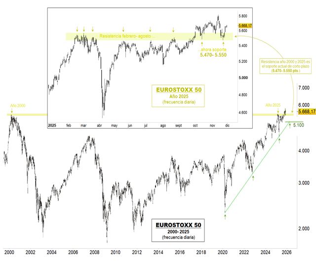 Por su parte, el EUROSTOXX 50, ha ratificado entre 5.470- 5.550 puntos una zona de soporte, que se corresponde con los mínimos de octubre, que a su vez comprende toda la zona de resistencias desde febrero a agosto, ahora soporte de corto plazo que precede al paso de la directriz alcista principal, actualmente en 5.100 puntos.