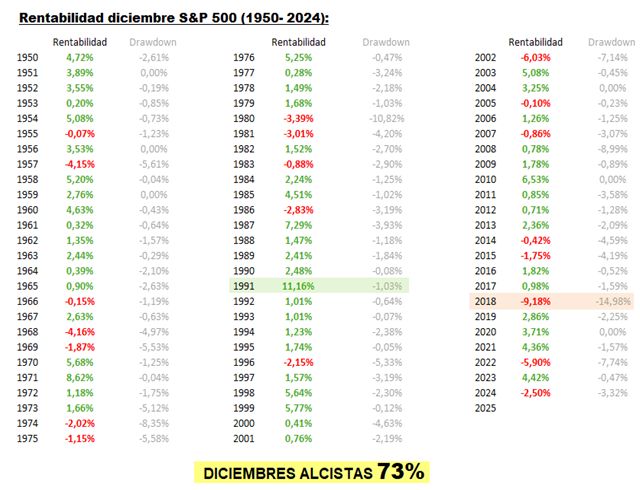 Los índices americanos encaran diciembre acumulando siete meses seguidos de subidas, desde que en abril comenzaran a recuperar las caídas del mes de marzo. Desde el año 1950, diciembre ha sido para el S&P500 el mes en el que en mayores ocasiones ha cerrado en positivo (73% de las ocasiones), como se detalla en la tabla inferior.