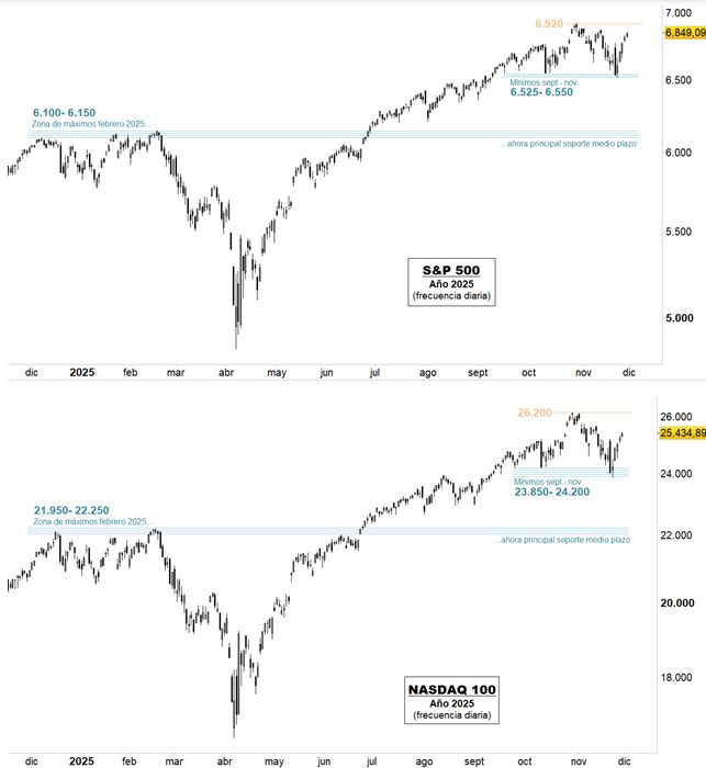 Tanto el S&P500 como el NASDAQ100 han venido ratificando los mínimos de septiembre y noviembre como el soporte intermedio más relevante previo a los máximos de febrero de este año, ahora principal soporte en el medio plazo. Así, los 6.525- 6.550 puntos del primero se alzan claves en el corto plazo, antecediendo la zona de 6.100- 6.150 puntos. Del mismo modo, el tecnológico presenta en 23.850- 24.200 su primera referencia, previa a 21.950- 22.250 puntos.