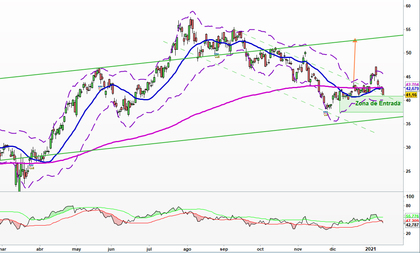 Comentarios: Wheaton Precious Metals Corp (WPM), es alcista para largo plazo. En estos momentos, se encuentra rompiendo la pauta de continuidad y realizando su pull-back. Tiene un posible objetivo sobre los 55 dólares. El punto a vigilar para este trimestre serían los 35 dólares. Este punto sube 0,7 dólares cada mes. Si lo perdiera, indicaría debilidad.