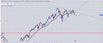 El nasdaq100 saca los pies, la cabeza por debajo del triangulo, de momento son los futuros veremos como cierra hoy la sesión puede dar la pista para ver la dirección del mercado en las próximas semanas.