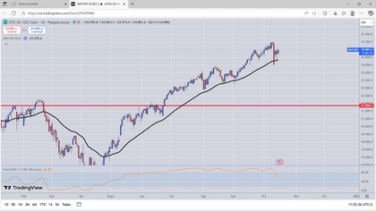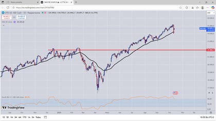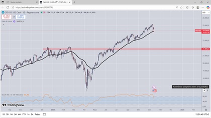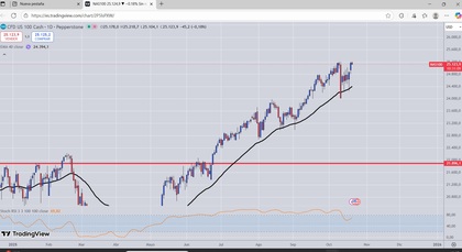 GRAFICO DIARIO NASDAQ100 Wall Street anticipa cautela este miércoles en un mercado que permanece atento a los resultados empresariales y a las relaciones comerciales entre EEUU y China, después de que el presidente Donald Trump haya puesto en duda la reunión de la próxima semana con su homólogo chino, Xi Jinping. A esto se suma el cierre del Gobierno, que se mantiene mientras demócratas y republicanos siguen sin alcanzar un acuerdo presupuestario.