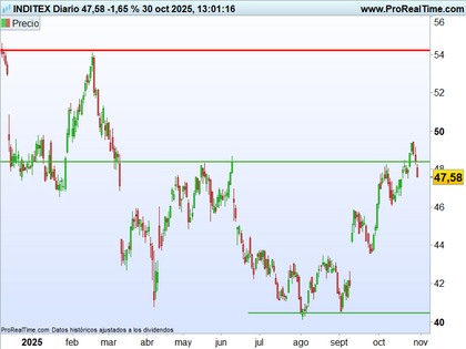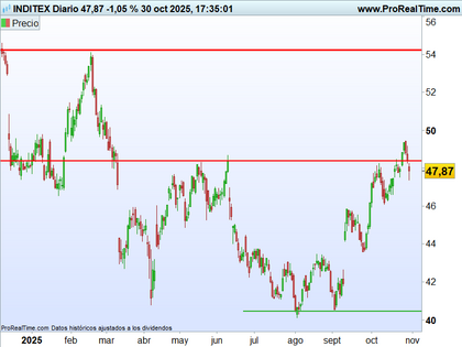 El valor marcó máximos históricos en 56,34 euros el 5 de diciembre del año pasado, pero desde entonces se ha alejado de estas cotas, situándose actualmente un 12,64% por debajo. Pero lo cierto es que su panorama ha mejorado gracias al buen inicio de la temporada de otoño. Inditex mantiene la confianza de los analistas, que de forma mayoritaria le dan una recomendación de ‘comprar’. El potencial es moderado: la media de casas de análisis que cubren al valor otorgan un precio objetivo de 51,40 euros, un 4,43% por encima de los niveles actuales.