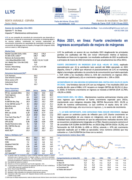 * De las empresas que presentan números negros (beneficio neto), LLYC es la más barata de todas por EV/Ebitda. * Es la 2ª más barata por PER ó por EV/beneficio neto * Y es junto con Altia y Miogroup de las pocas que no tienen una alta cantidad de activaciones por trabajos realizados por la empresa para su activo (autotrabajos) respecto al ebitda. * Además forma parte del selecto grupo de empresas que no tienen deuda sino caja neta, y del selecto grupo de empresas que hace guidance para 2022 (para 2022 esperan 15,9 millones de euros de EBITDA sin contar las probables adquisiciones que pueden realizar este año, con lo que estarían cotizando por debajo de las 8x EV/ebitda para 2022, sin contar aún con posibles adquisiciones; puramente orgánico) * Y pertenece al selecto grupo de empresas que además de crecer a un ritmo elevadísimo, pueden permitirse repartir dividendo.