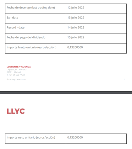 Hecho relevante En relación con el OIR publicado el 27 de abril de 2022 sobre los acuerdos adoptados por la Junta General Ordinaria de Accionistas celebrado el mismo día. Como acuerdo quinto del orden del día se aprobó la distribución de un dividendo extraordinario con cargo a la reserva de prima de emisión, por un importe bruto de 0,1320000 euros por cada acción en circulación (que correspondía en dicho momento con un importe bruto total de 1.491.790, 80 euros) que será pagado el 15 de julio de 2022. En dicho acuerdo, se delegó en el Presidente del Consejo de Administración de la Sociedad para que designara, en su caso, a la entidad de pago y realice las demás actuaciones necesarias o convenientes para el buen fin del reparto. A continuación, detallamos el calendario de pago del dividendo: