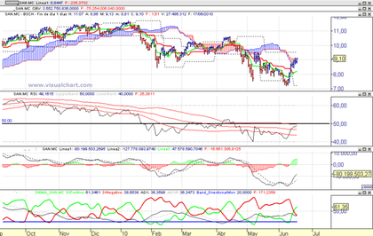 Las acciones del Santander están en una tendencia alcista imparable que sube sin descanso. No es demasiado normal tanta fuerza ya que no descansa ni recula para nada. En 1 semana ha subido desde 7.20€ y ya está 9.10€,